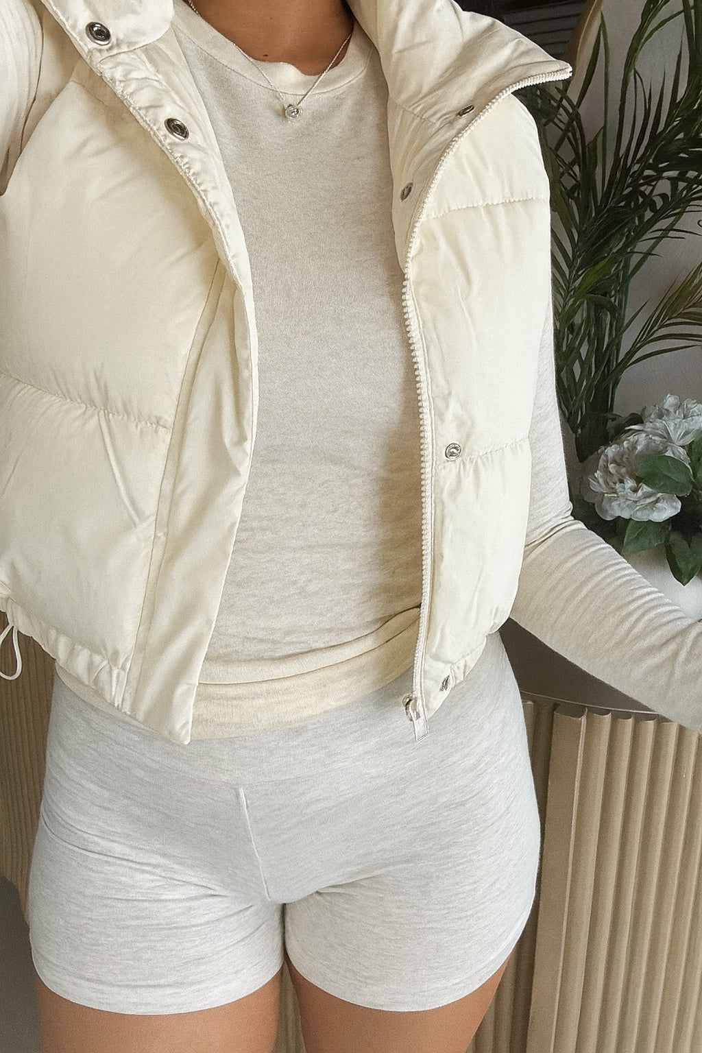 Elevate your everyday style with this chic ivory puffer vest — the perfect blend of cozy warmth and effortless sophistication. Designed with a sleek cropped fit, soft quilted padding, and a high-neck collar, it layers seamlessly over your favorite basics for a polished yet laid-back look. The neutral ivory hue makes it endlessly versatile, pairing beautifully with everything from casual loungewear to elevated street style. Lightweight yet insulating, it’s the must-have piece for transitional weather and on-the-go days.